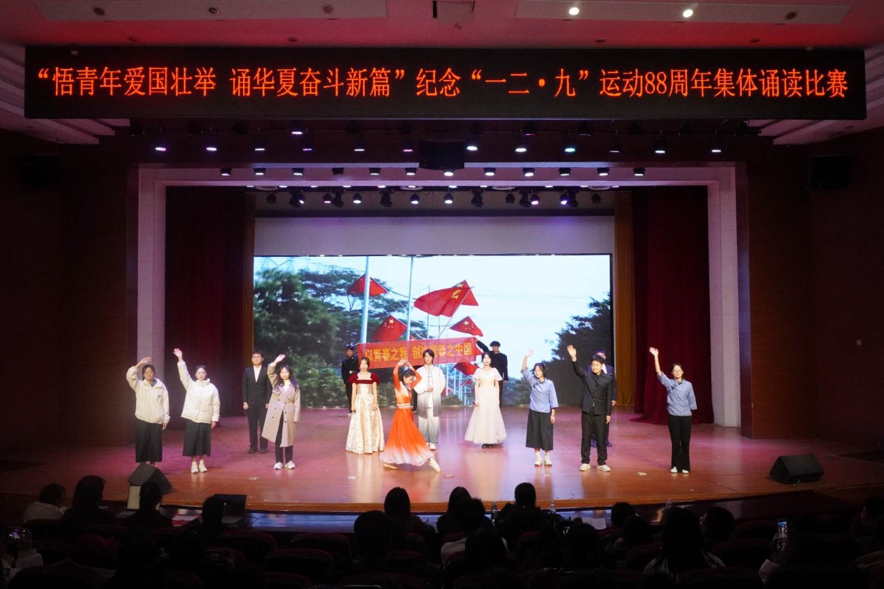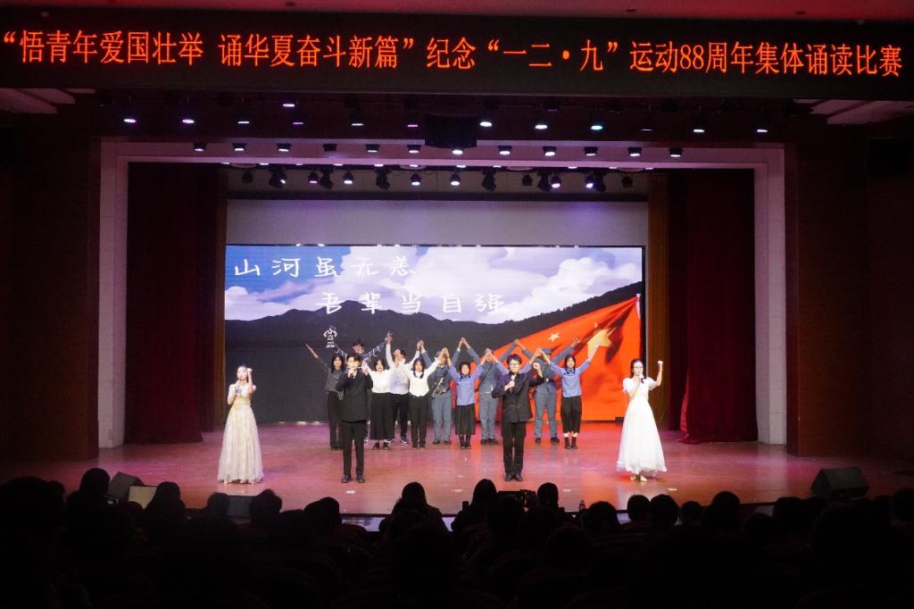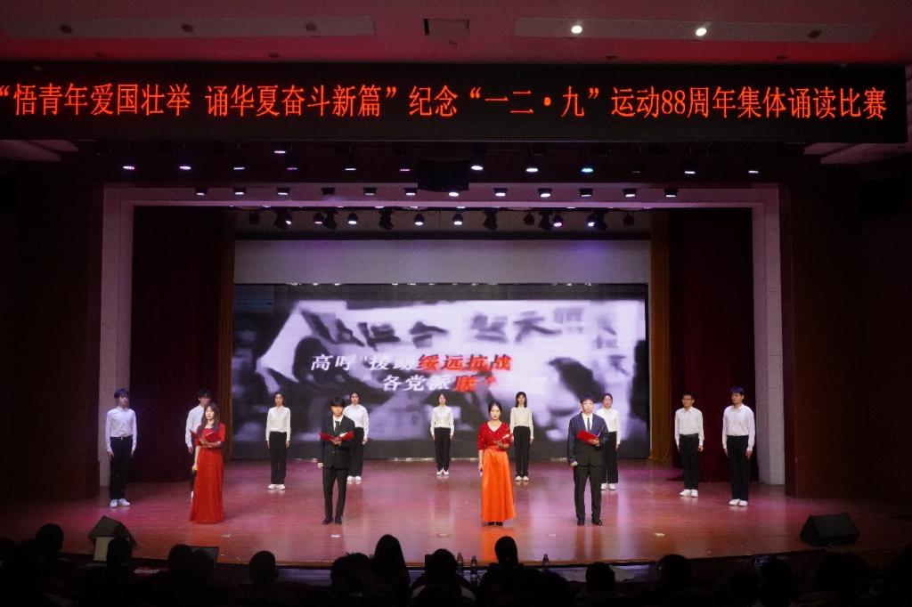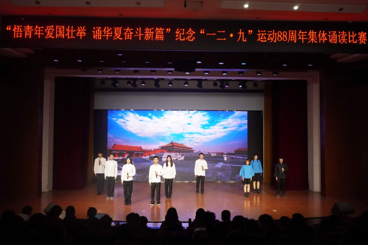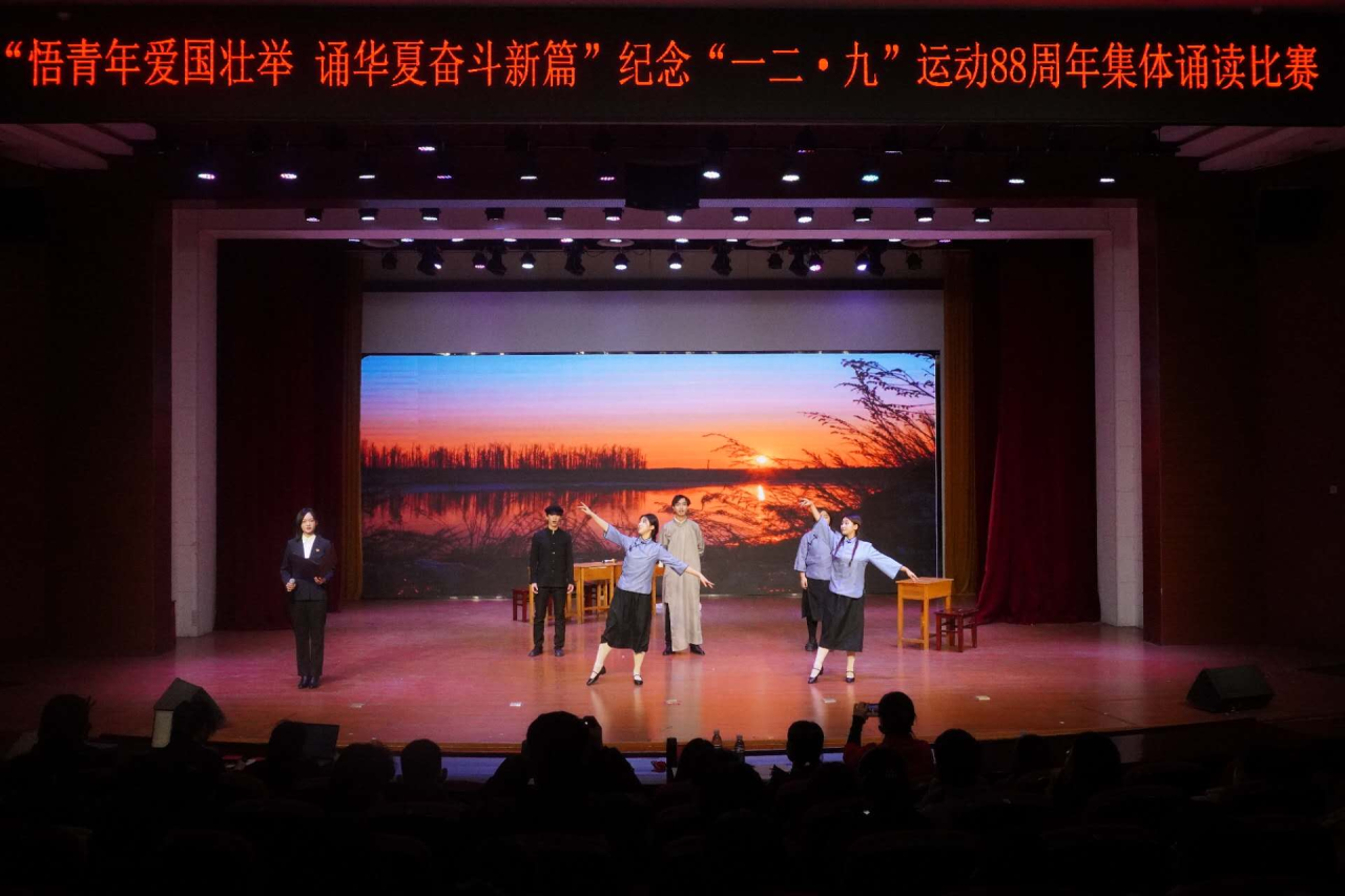 为纪念“一二·九”运动,大力弘扬以爱国主义为核心的民族精神,进一步激发青年学生爱党爱国、爱校荣校热情,引导青年学生坚定理想信念,传承红色基因,青春建功新时代,12月6日,由校团委主办,校学生会承办的“悟青年爱国壮举,诵华夏奋斗新篇”纪念“一二·九”运动88周年集体诵读比赛在畿辅文化会堂举行。