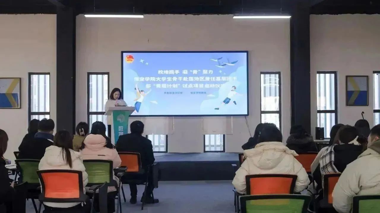 为发挥共青团实践育人在高校“大思政”工作体系中的重要作用,为青年学生搭建社区建功平台,引导青年学生在服务群众的生动实践中感知科学理论的真谛,在学校党委关心支持、校团委和团莲池区委共同筹备下,我校大学生骨干赴莲池区兼任基层团干部--“青雁计划”试点项目正式启动。“青雁计划”将选派优秀大学生骨干赴社区兼任基层团干部,深化校地共青团共建,丰富大学生社会实践活动。经过前期的组织和选拔工作,12月22日,在保定市大学生交流服务中心举行启动仪式。