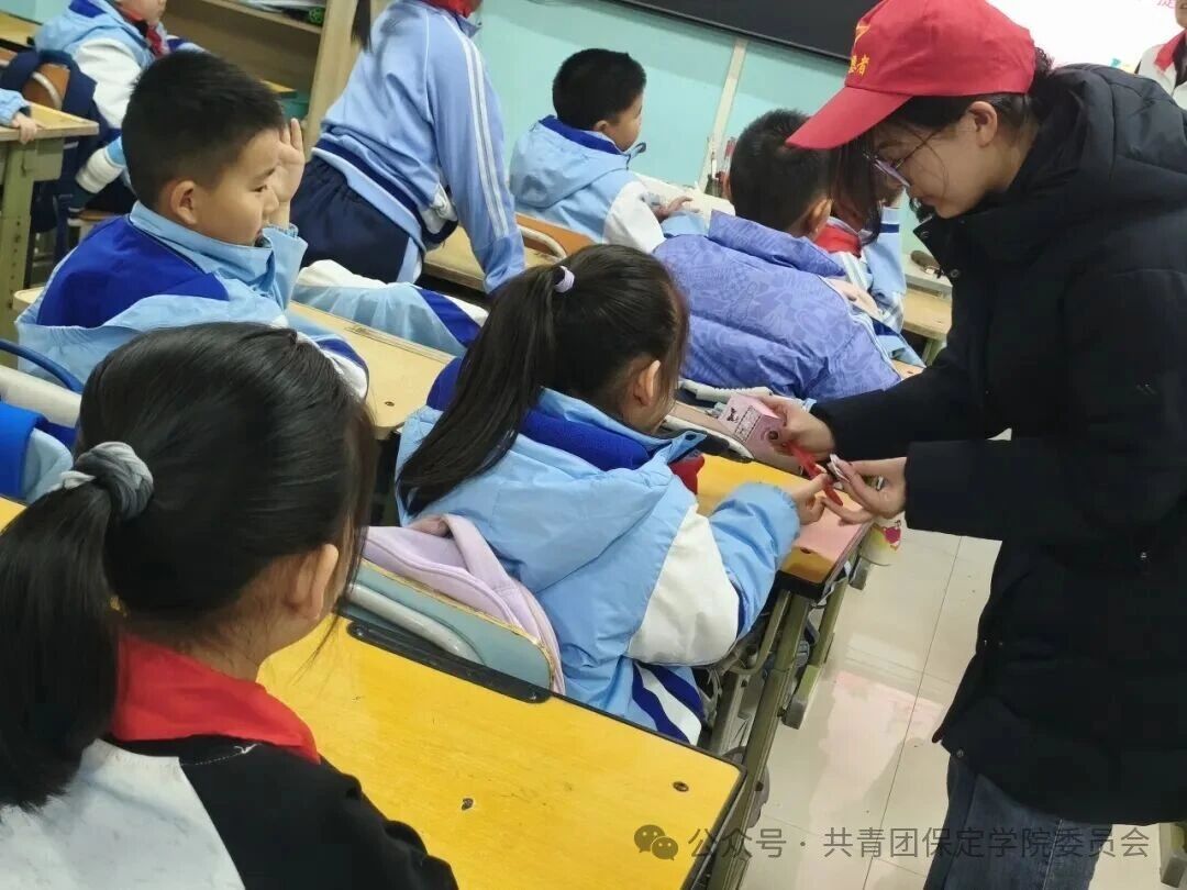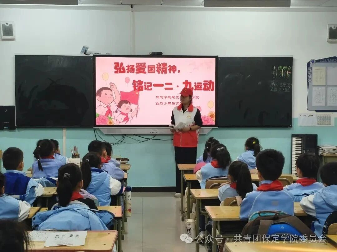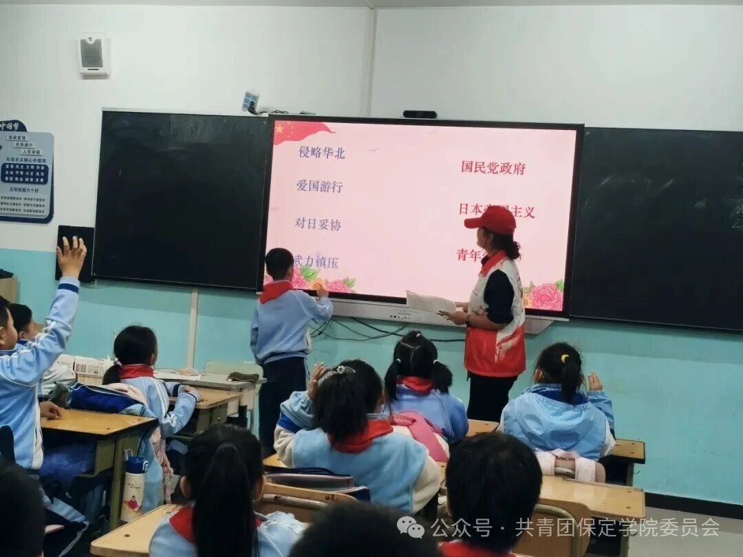 马克思主义学院红旗方阵讲师团走进河北保定师范附属学校开展“一二·九运动”主题宣讲志愿服务活动。志愿者们用通俗的语言为孩子们讲解历史,准备礼物鼓励小朋友回答问题分享感悟。此次志愿服务活动让红色基因在孩子们心中落地生根,铭记革命先辈的奋斗精神。