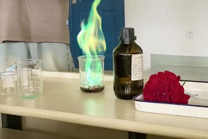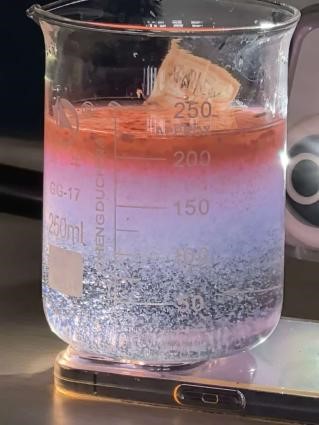 决赛现场,参赛团队将实验室搬上讲台,通过精彩的现场演示与生动的讲解展现科学奥妙。"梦幻彩虹雨"团队用分层液体展示色素在不同密度间穿梭形成彩虹雨,演示密度差异原理;"多彩生态大象牙膏"团队混合试剂触发泡沫喷涌,引发热烈掌声;"玫瑰的盛开"团队通过氯化锶粉末与乙醇燃烧,展现锶元素洋红色焰色反应。