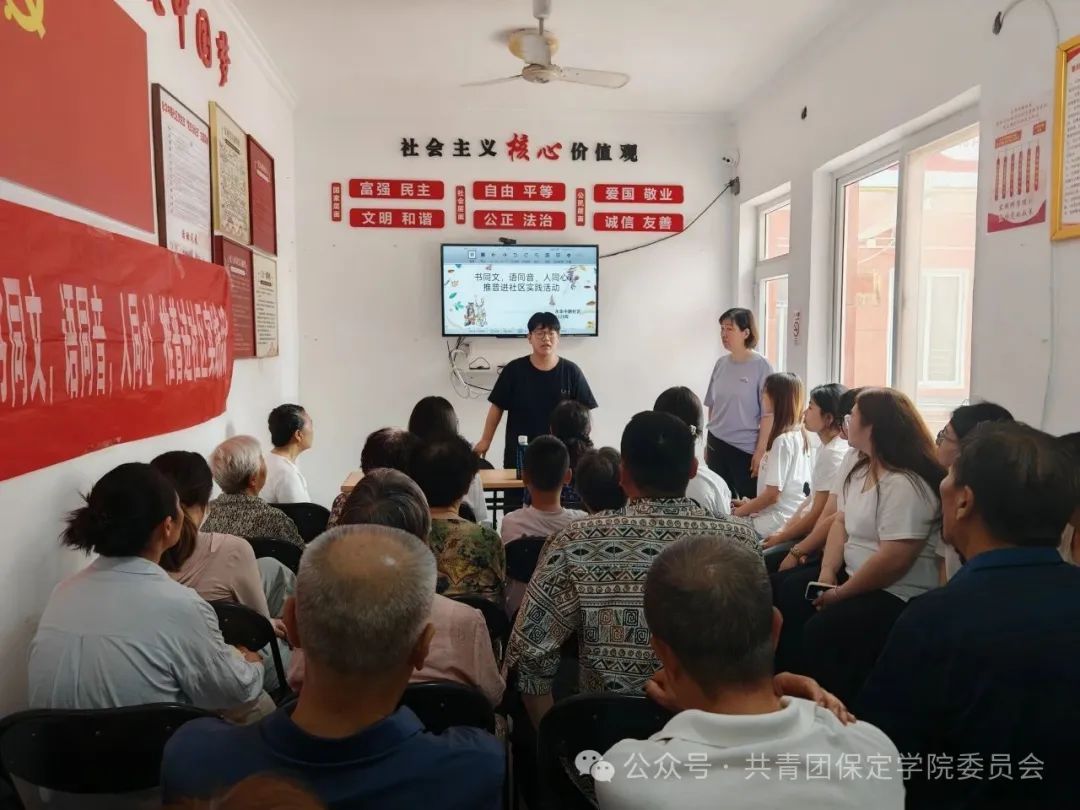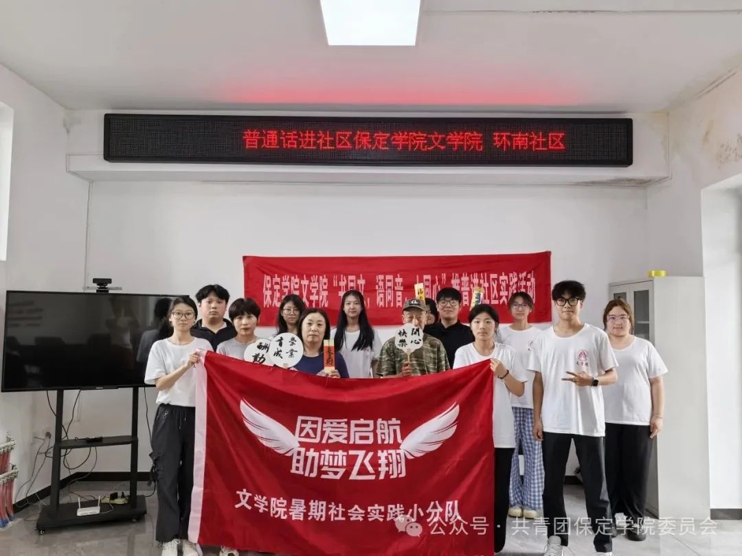 为提升社区居民语言素养,助力社区文化建设,2025年7月,文学院“因爱起航,助梦飞翔”社会实践团队联合莲池区文明办,开展了“书同文,语同音,人同心”推普进社区活动。该活动面向社区居民,通过多元形式普及普通话知识,弘扬中华优秀传统文化。