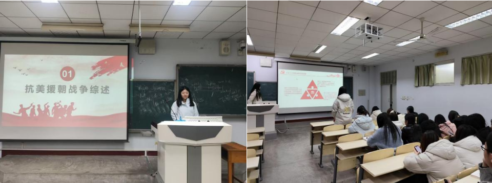 活动围绕抗美援朝精神的基本要义展开。活动开始,团支书通过播放抗美援朝相关纪录片,讲述志愿军英雄事迹等形式,深度阐释了“抗美援朝精神”的内涵、历史意义及其当代价值。激励同学们感悟“祖国和人民利益高于一切”的精神素养。
