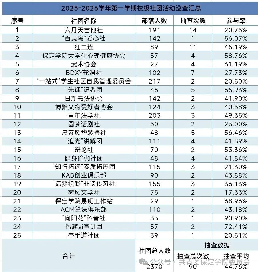 社团抽查中,"向阳花"科普社参与率高达90%,"先锋"记者团、智趣AI宣讲团、易班工作站等社团参与率也超65%,整体抽查平均参与率为45%。这一数据既展现出部分社团凭借优质活动与紧密的成员联结,收获了亮眼的参与表现,也反映出社团发展的不均衡性:部分高参与率社团的活动开展频次偏低,成员基数的差异也直接导致不同社团的参与率呈现出明显落差。社团管理部累计完成90次巡查监督,既为社团活动的规范落地筑牢了基础,也从侧面体现了社团文化建设的稳步推进与鲜活活力。