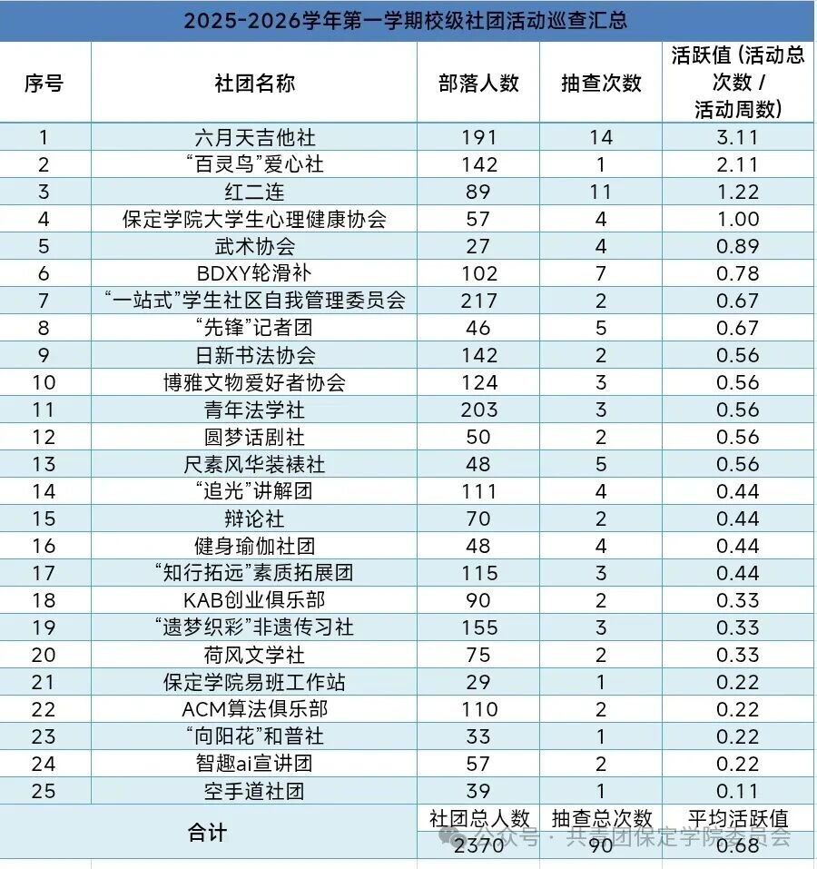 本学期经过社团纳新、面试,活动时间从10月20日到12月21日为期九周。活跃值计算方式为活动总数/活动周数。整体平均活跃值为0.68。各社团均开展了形式多样的活动,其中六月天吉他社以3.11的活跃值位居榜首,“百灵鸟”爱心社、红二连等社团也展现出良好的活动开展积极性,不同类型的社团结合自身特色持续组织活动,为校园文化建设注入了丰富活力,整体呈现出社团覆盖面广、活动开展常态化的良好态势。