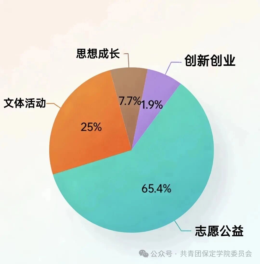 数据显示,志愿公益65.4%、文体活动类25%,思想成长7.7%、创新创业类1.9%,志愿公益、文体活动类参与占比最高,思想成长、创新创业类占比相对较低。