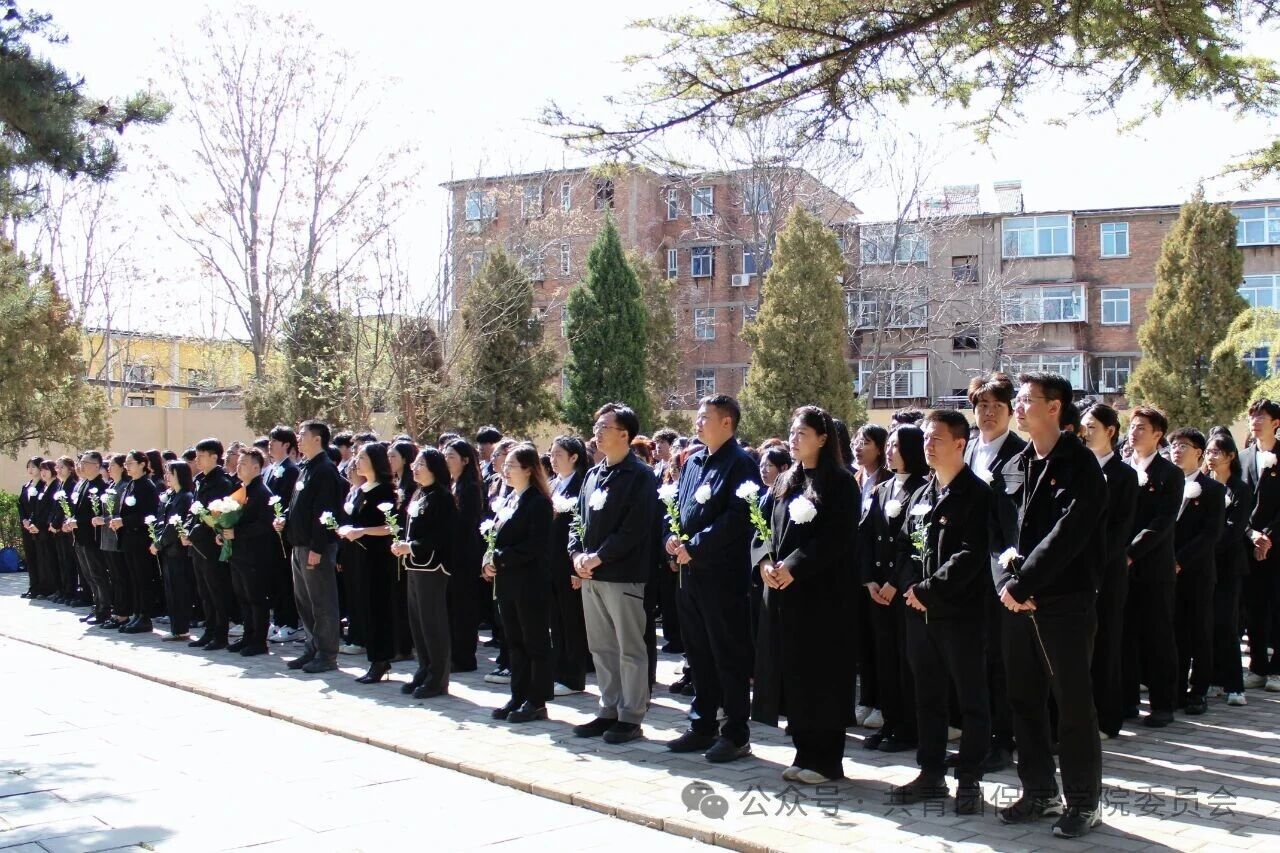 活动中,全体师生肃立默哀并三鞠躬,向七六烈士敬献花篮和小白花,表达对革命先烈的深切缅怀与崇高敬意。